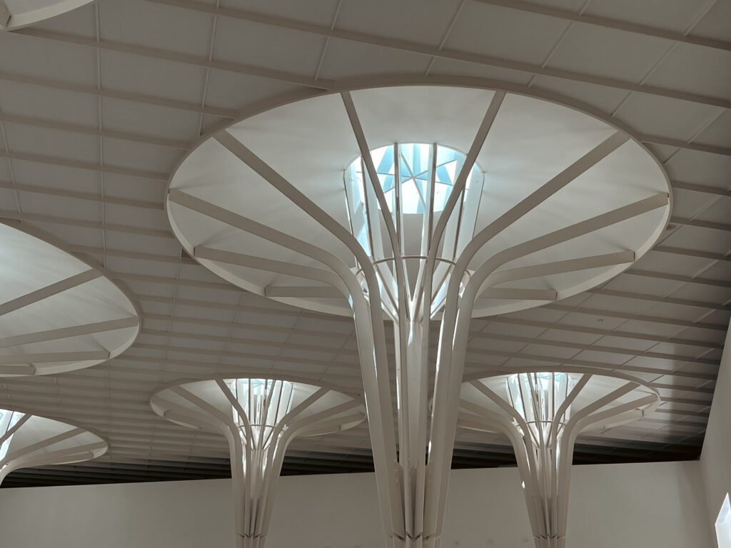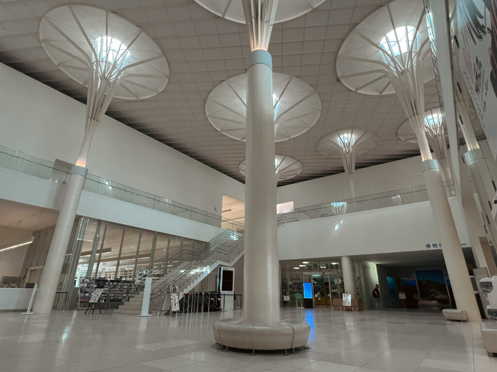 從室外過渡到室內,厚重與輕盈的激烈反差,正是沖繩博美「不相稱」的美感。挑高的大廳裡,一支一支細長柱子直通到屋頂,圓形造型連接內凹的環形天窗,像是船桅頂部的瞭望座——只要看完展覽,便會明白這個設計其來有自,置身白色螺旋之下,便彷彿走在貝殼的內部,是否很像呼應了沖繩史前時代精彩的貝塚文化呢?