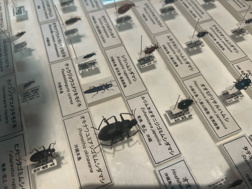印象深刻,常設展覽中的一個展示板,主題為「海流下的物種遷徙」(海流による動物の移動),提到了深海峽阻礙了沖繩南北動物的交流,使得北琉球和中琉球之間,形成鮮明的物種差異,這名為「渡瀨線」(Tokara Strait)的生態界線,但也有動物利用海漂「越界」,比如黑腹姬蜥、沖繩蜥蜴、南宮壁虎、琉球樹蛙、津田氏大頭竹節蟲等,解釋了黑潮對琉球群島陸生動物分佈的影響。