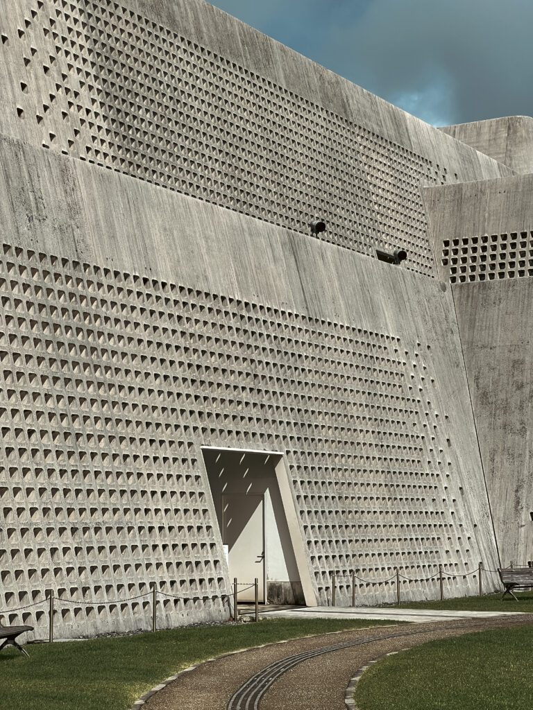 乍看之下,這座森嚴的水泥建築,有人說很像碉堡,有人說是軍事基地,由建築師能勢修治(Nose Shuji)操刀設計的沖繩縣立博物館・美術館(以下簡稱沖繩博美),高築外牆遍佈孔洞,造型靈感其實來自沖繩特有的石灰岩地貌以及琉球王國的古城堡「Gusuku」的結合。