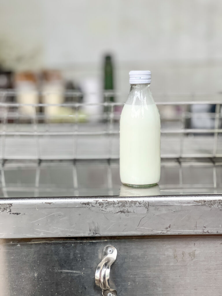 一次走到巷底,被車庫裡的「鮮羊乳」招牌吸引,走進問才知道是一家鮮羊乳專賣店!超級低調地開在鐵棚下,一籃老式玻璃瓶裝的羊乳,另一籃是歸還的空瓶。