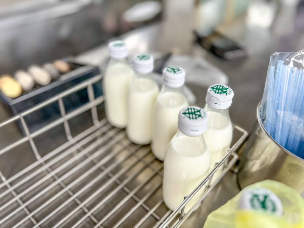 「都是當日現擠。」年歲是阿伯級的老闆說。一瓶30元,現場「立飲」,也可以買走,「但是瓶子要拿回來還喔。」